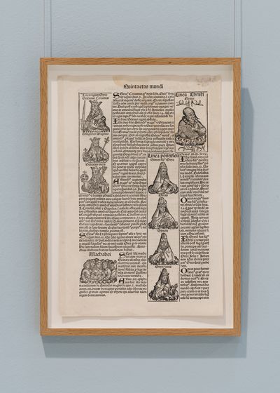 Page from the book Liber Chronicarum which is an illustrated biblical paraphrase and world history that follows the story of human history related in the Bible. It is one of the first printed books to integrate illustrations and text.